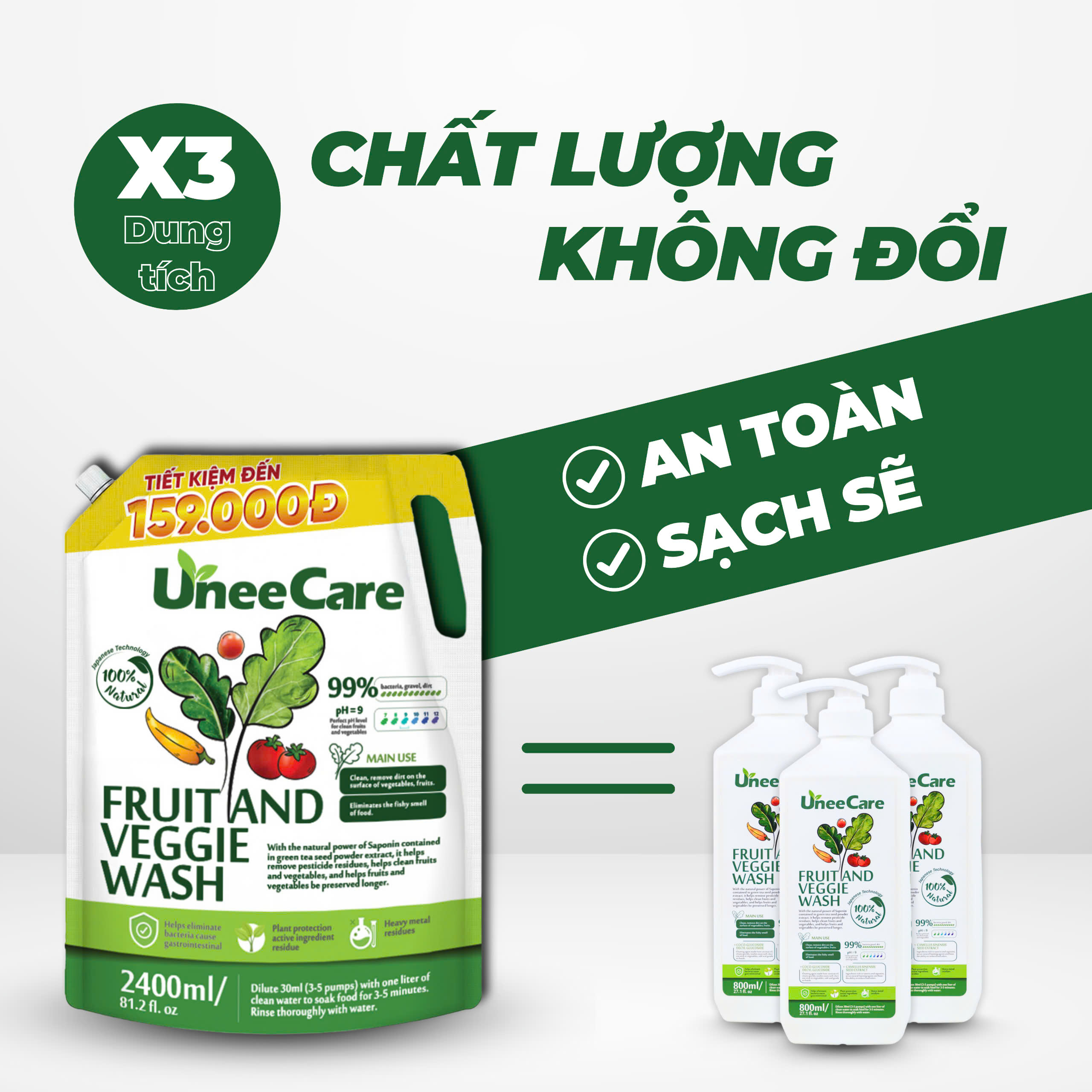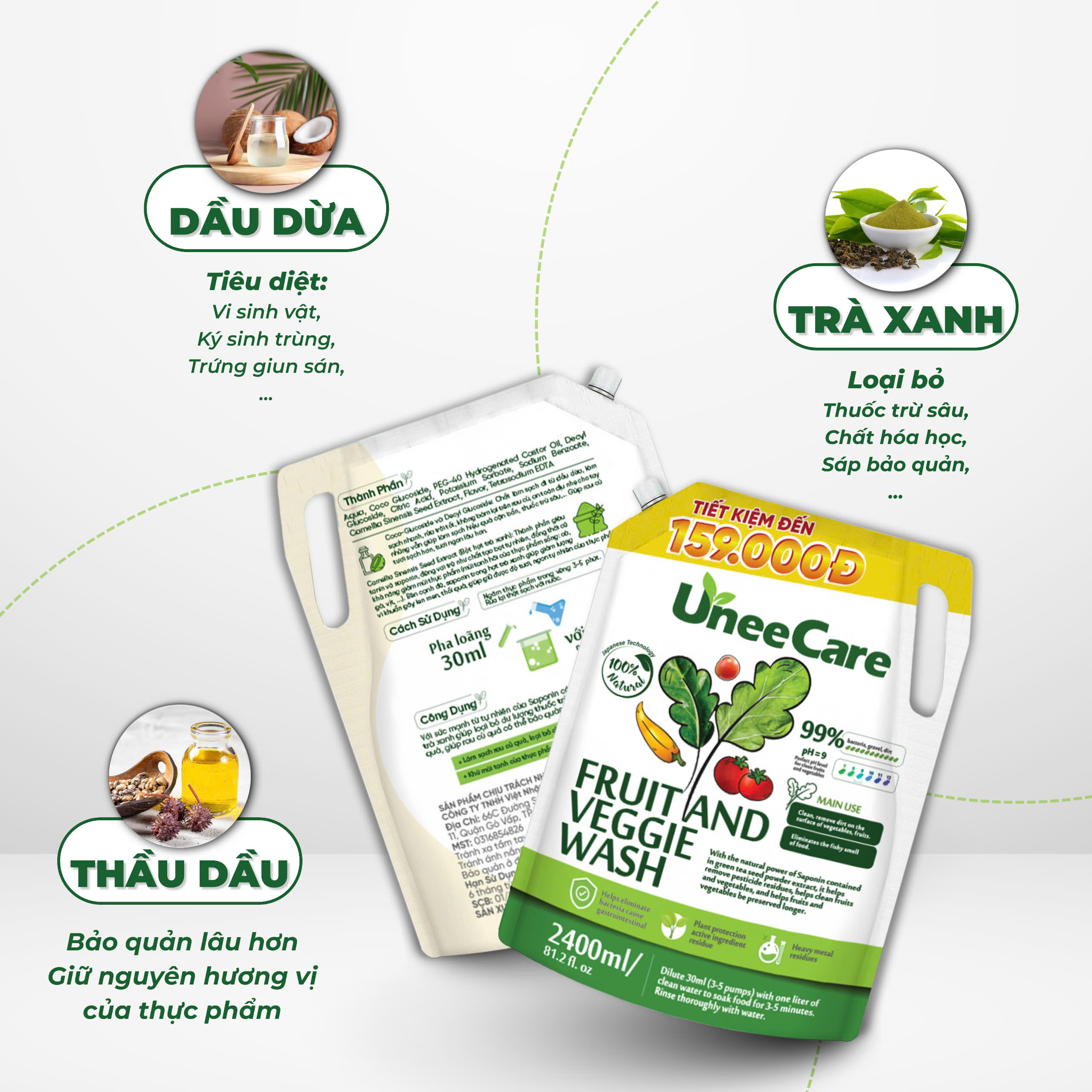 Combo này chứa các thành phần chiết xuất từ thiên nhiên như bột hạt trà xanh, tính chất dầu dừa,nước ion kiềm Ph 9.0 và kết hợp mùi trà xanh dịu nhẹ. Những hoạt chất này có khả năng làm sạch mạnh mẽ nhưng vẫn đảm bảo an toàn tuyệt đối, không ảnh hưởng đến hương vị hay giá trị dinh dưỡng của thực phẩm.