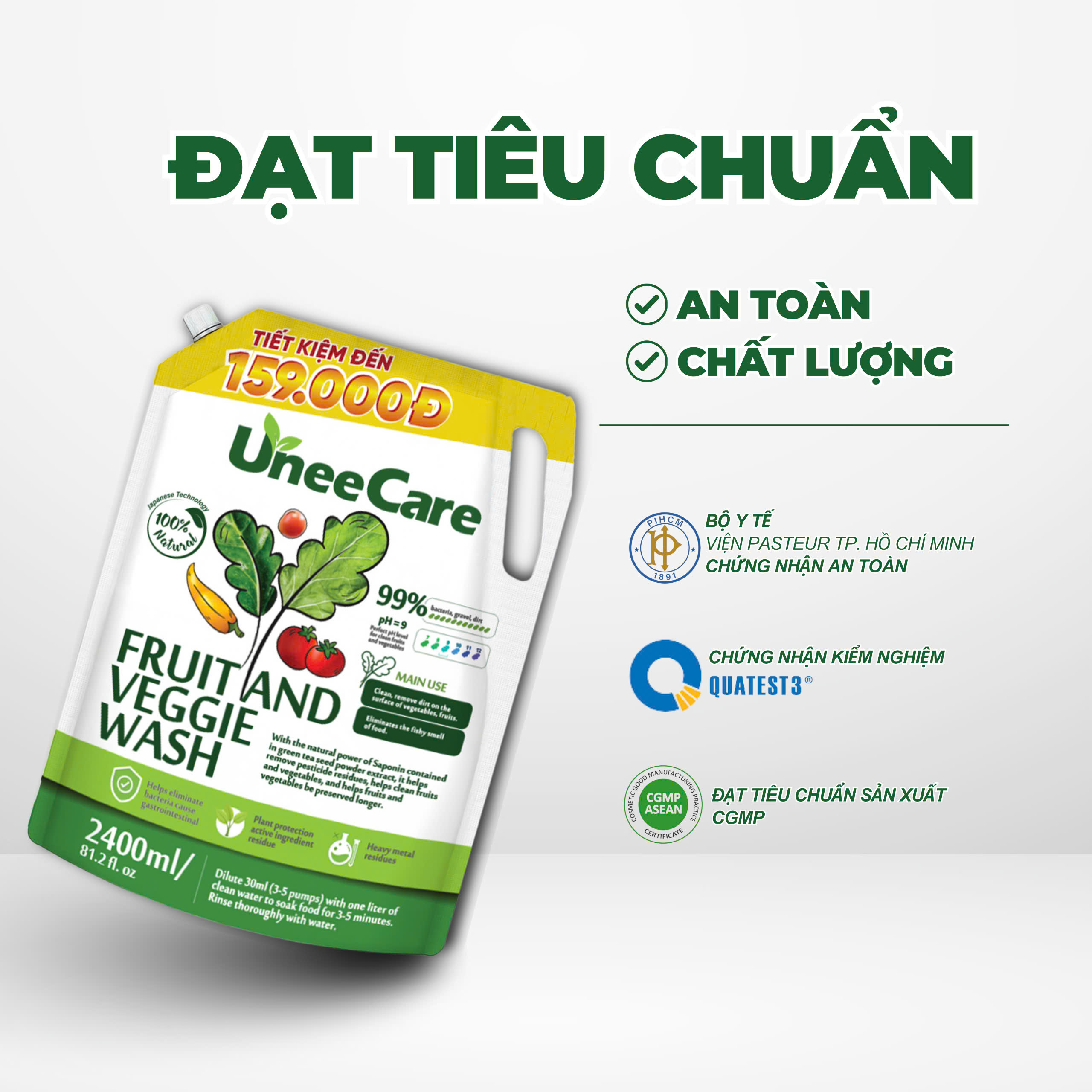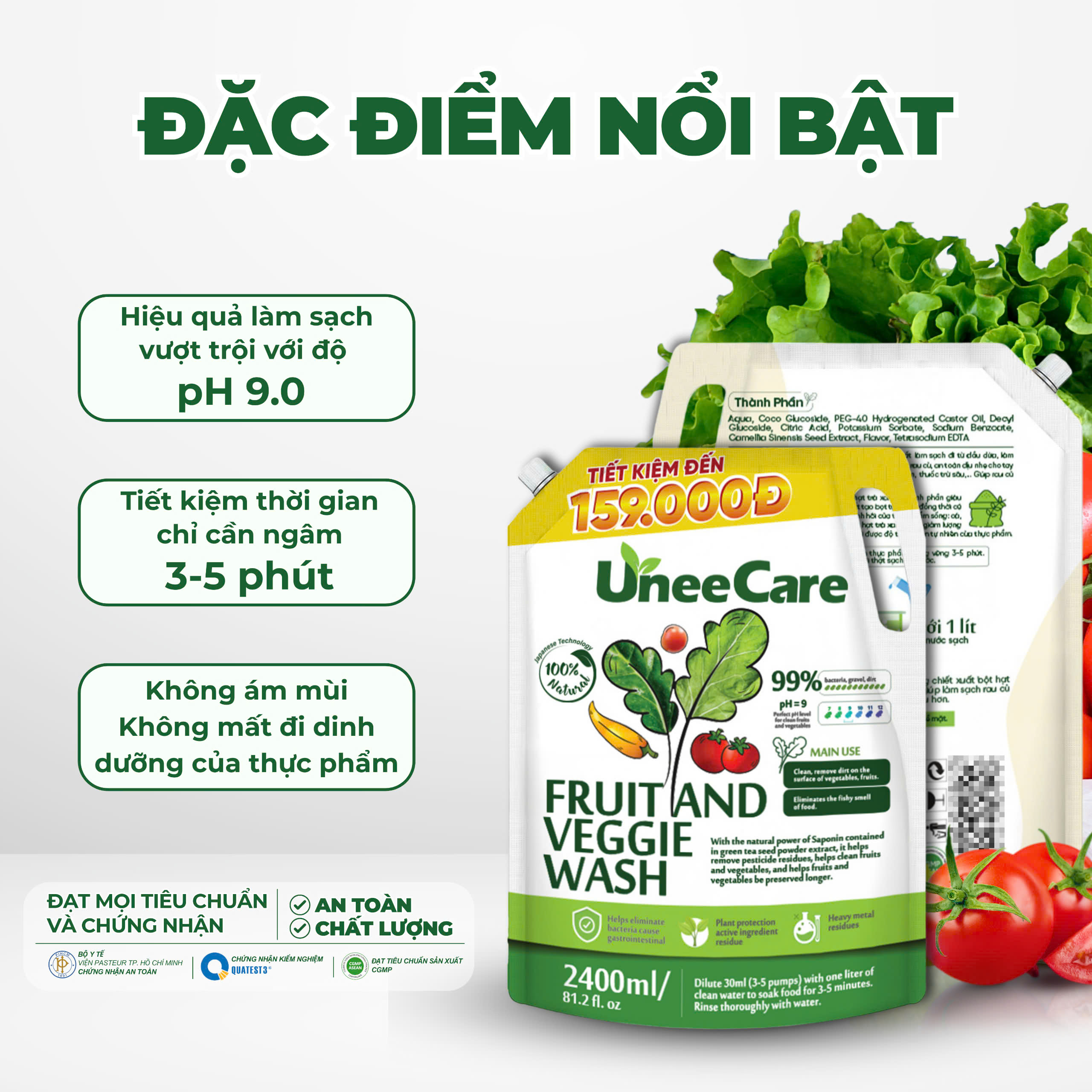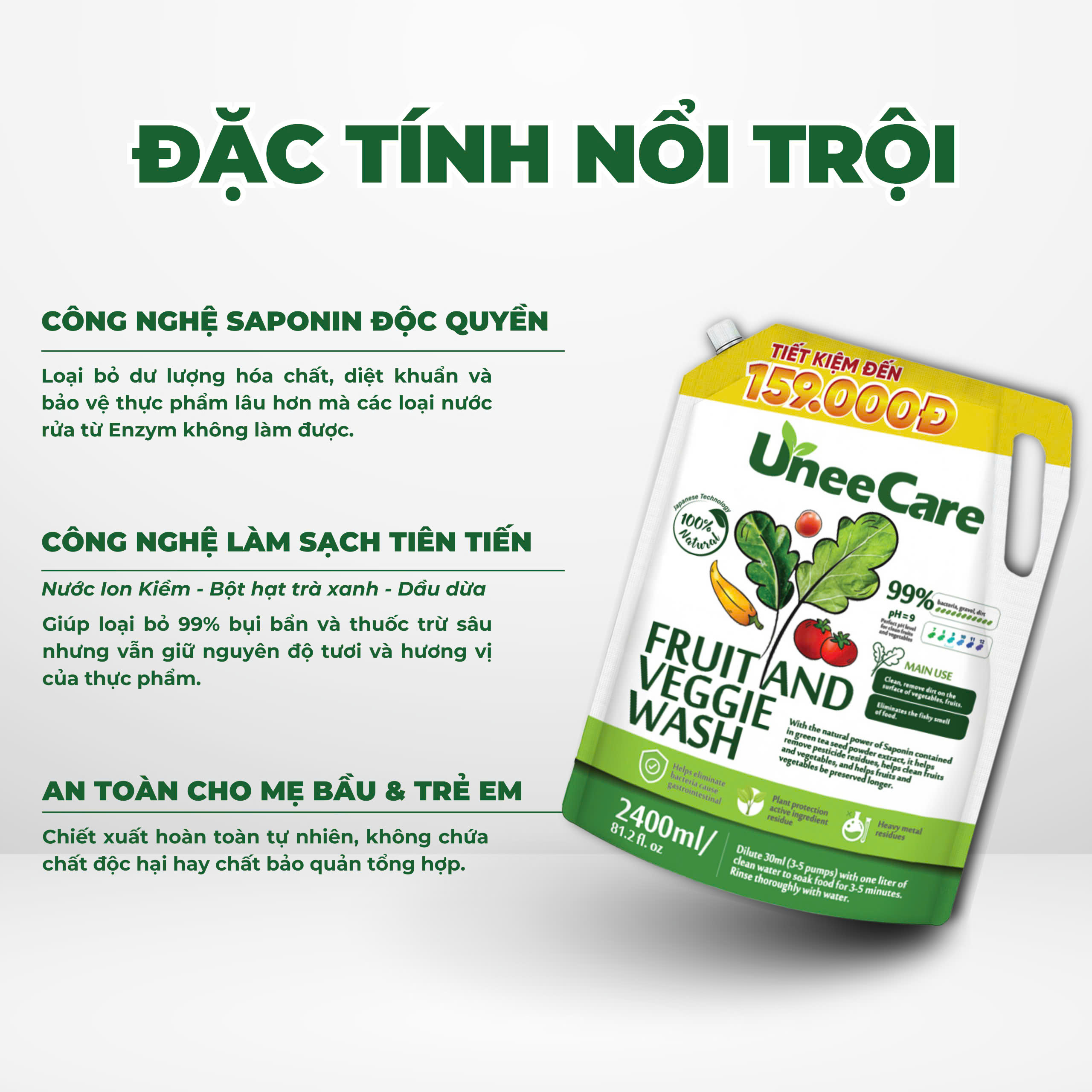Với chiết xuất từ bột hạt trà xanh, tính chất dầu dừa,nước ion kiềm Ph 9.0, sản phẩm giúp loại bỏ bụi bẩn, vi khuẩn, trứng giun sán, dư lượng thuốc trừ sâu còn sót lại trên rau củ, trái cây mà không làm mất đi dưỡng chất tự nhiên.